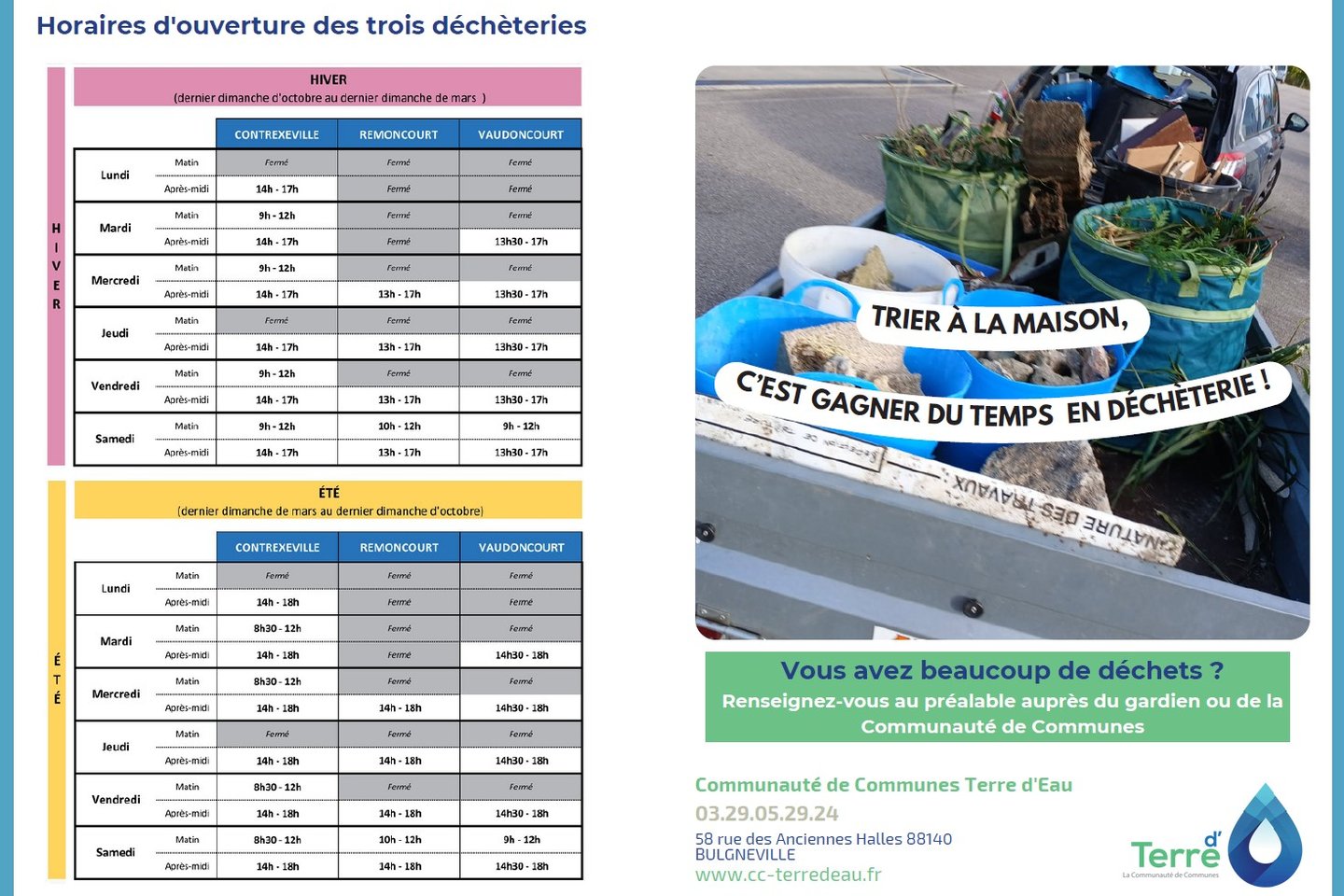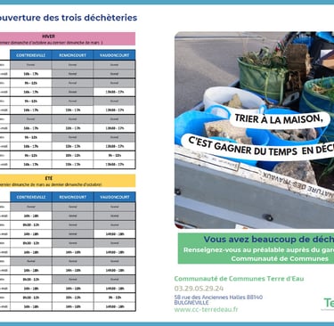 Sperrgut, das nicht in die herkömmlichen Abfalltonen passt oder dort nicht hingehört, wird an speziellen Müllsammelstellen, den sogenannten "Déchèteries", gesammelt. An den Müllsammelstellen in Contrexéville, Remoncourt, Vaudoncourt können unteranderem gebrauchtes Öl, nicht verwendete Medikamente, Farbe und Lacke, Karton, Kunststoffe, Sperrgut, Kunststoffe, Holzabfälle, kleine Haushaltgeräte, Mobiliar und Grünabfall abgegeben werden. Bitte beachten Sie, dass Erde nicht angenommen wird und die Müllsammelstellen nicht für Gewerbetreibende zugänglich sind.